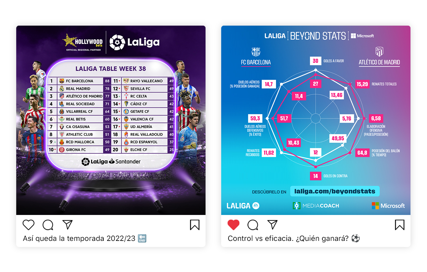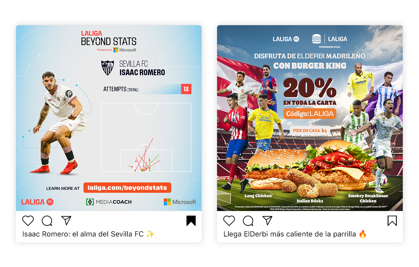 Imágenes para redes sociales de LALIGA con algunos de sus patrocinios, como Microsoft, Hollywoodbets y Burger King.