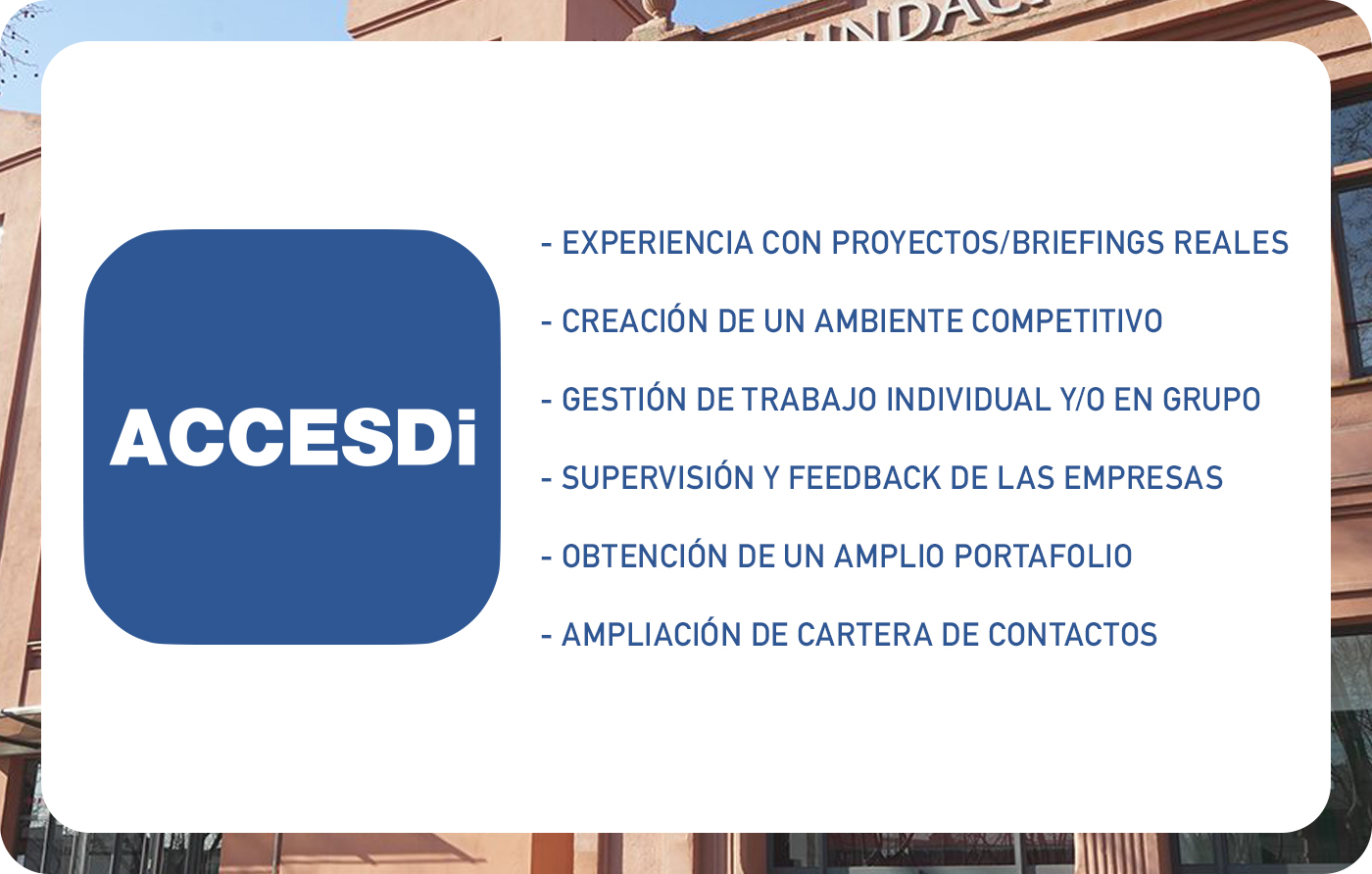 ACCESDi es un proyecto universitario que nace de la falta de concienciación de adquirir experiencia profesional real que tienen los alumnos de diseño gráfico.
